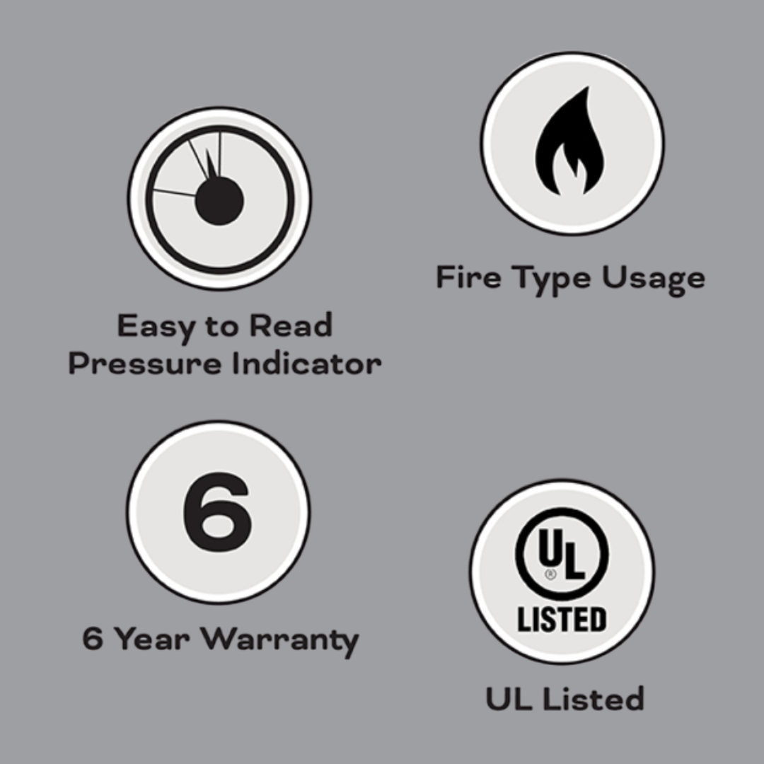 Additional Features- Easy-to-read pressure gauge indicates when the extinguisher is charged and ready for use.