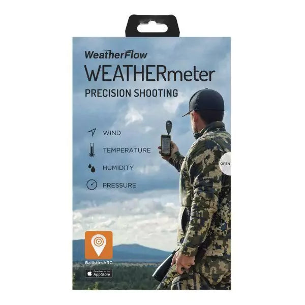 The WeatherFlow WEATHERmeter for Precision Shooting, designed for BallisticsARC, captures a complete on-site atmospheric profile, including wind, temperature, pressure, relative humidity, and density altitude. It integrates seamlessly with the BallisticsARC app and uses Bluetooth Smart technology for quick pairing with mobile devices, enhancing long-range shooting accuracy.
