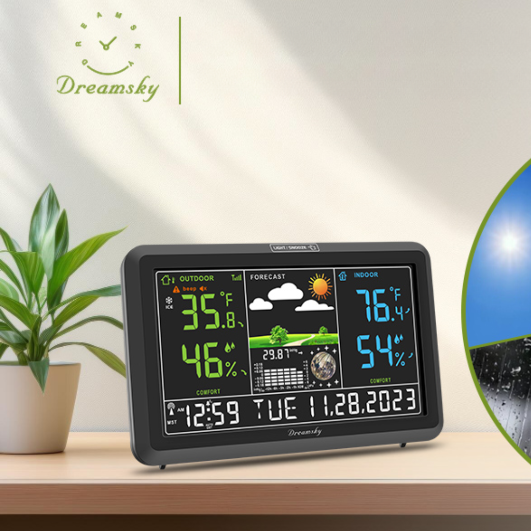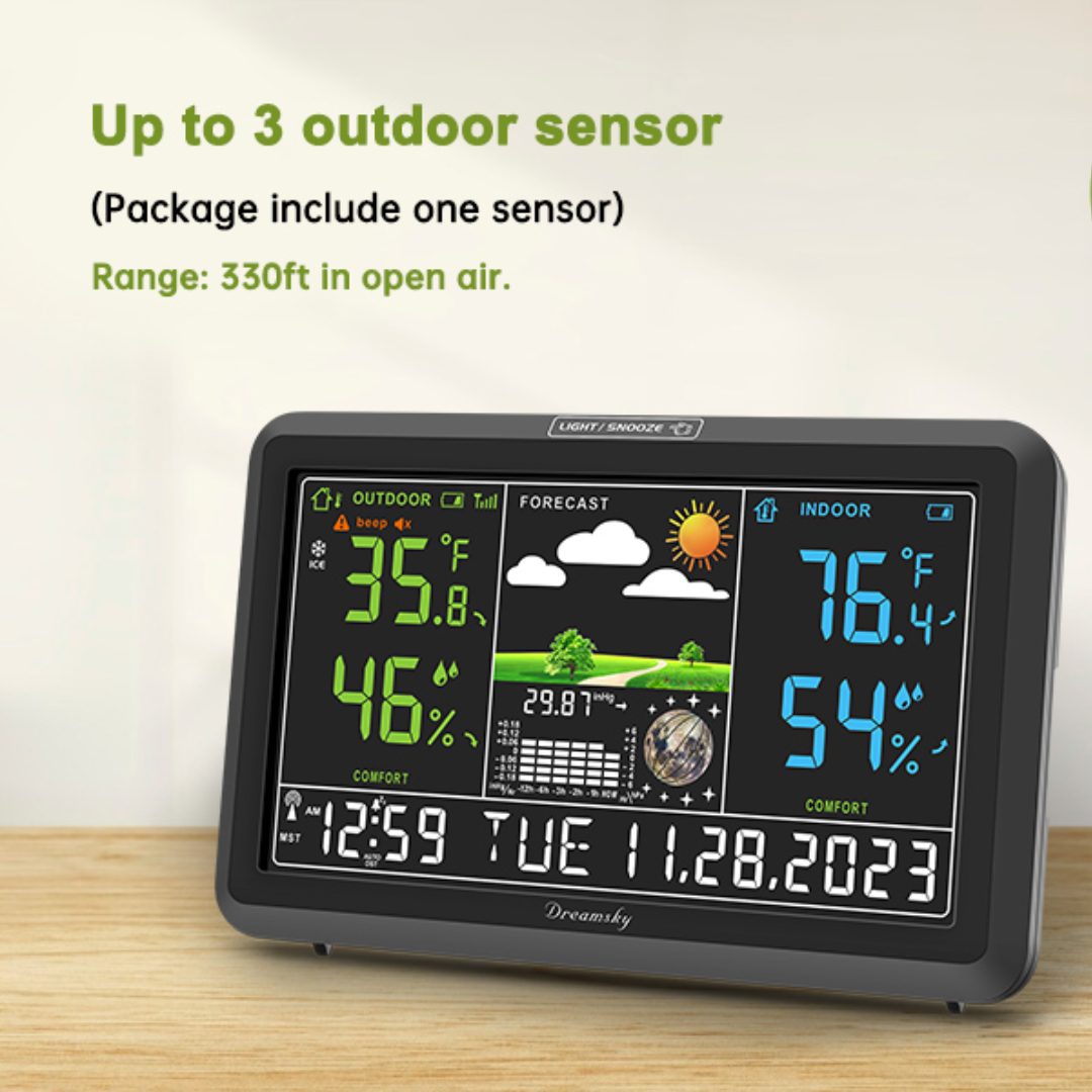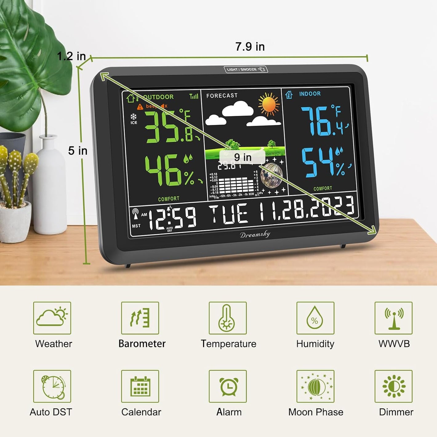 Illuminated Indoor Outdoor Weather Station for Home with Large Colorful Display. Our home weather station delivers large big numbers for weather forecast info, indoor outdoor temperature, atomic time, date, year and calendar day, which is super easy to read from afar.