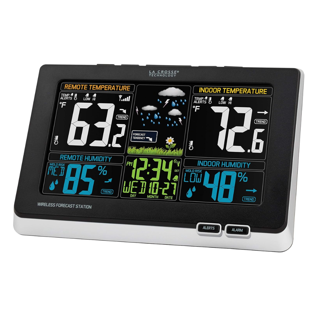 - Full-color LCD with weather icons: sunny, partly sunny, cloudy, rainy, stormy, snowy