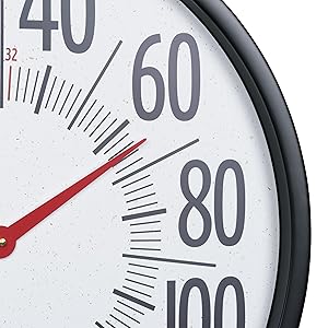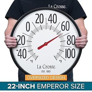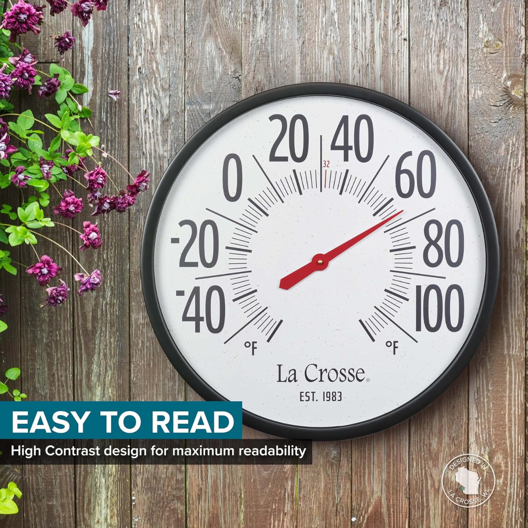 This extra-large, oversized circular analog thermometer measures 21.80 inches and is suitable for both indoor and outdoor use. It features a black plastic case and a UV-protected glass lens, encasing a speckled terrazzo white dial with bold black numbers that stand 2.90 inches tall, indicating temperatures from -60 to 120 degrees Fahrenheit. The La Crosse logo and the “1983” emblem are positioned just below the center of the dial.