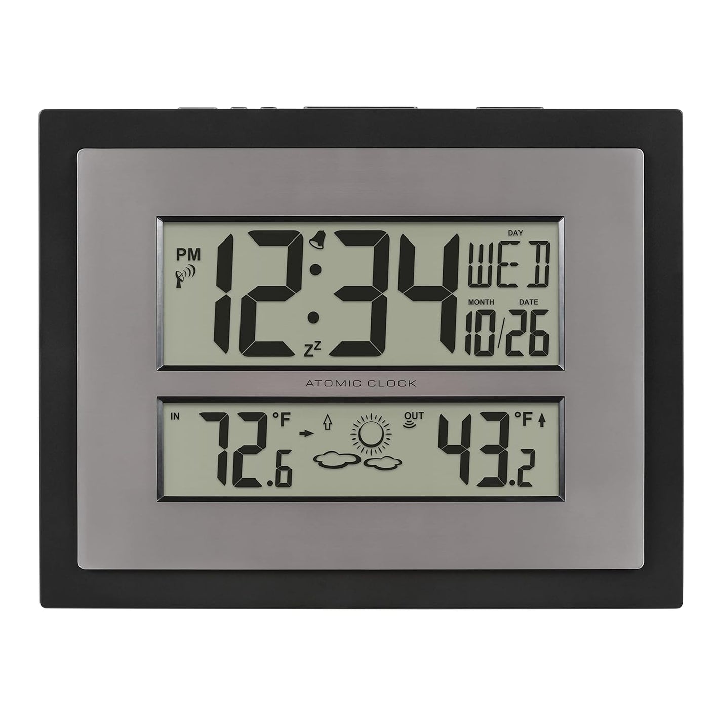 Monitor time, date, and indoor/outdoor temperature effortlessly with the La Crosse Technology Atomic Digital Wall Clock. Its elegant design features a black frame and brushed silver overlay, making it ideal for home or office. Displays precise atomic time, adjusts for Daylight Saving Time, and includes an outdoor temperature sensor.