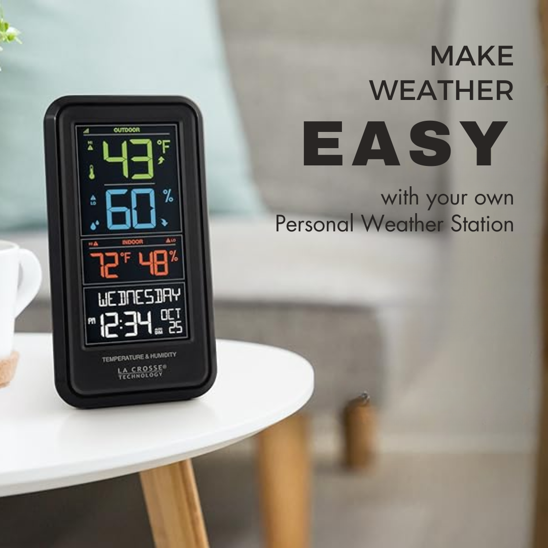 La Crosse Technology's wireless color weather station serves as your personal meteorologist, allowing you to check backyard temperature and humidity effortlessly. It features programmable alerts for extreme climate changes, a dynamic multi-color display, and a calendar view. With a 300 ft range and versatile mounting options, it ensures reliable monitoring.