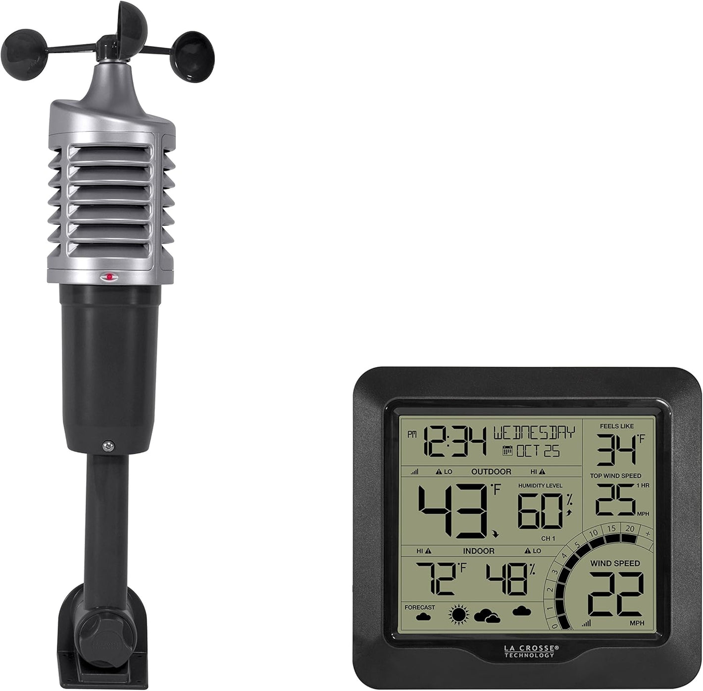 Outdoor multi-sensor (combines wind, temperature, humidity) and indoor display are battery operated (batteries not included)