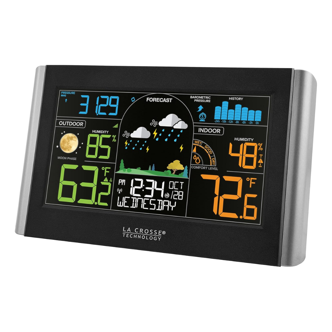 Plan your day effortlessly with La Crosse Technology’s Wireless Color Forecast Station. Its easy-to-read display shows current temperatures, barometric pressure trends, and seasonal foliage changes. Customizable alerts for temperature and humidity ensure optimal home conditions. With multiple time zones, languages, and adjustable features, it provides reliable information and stylish design.