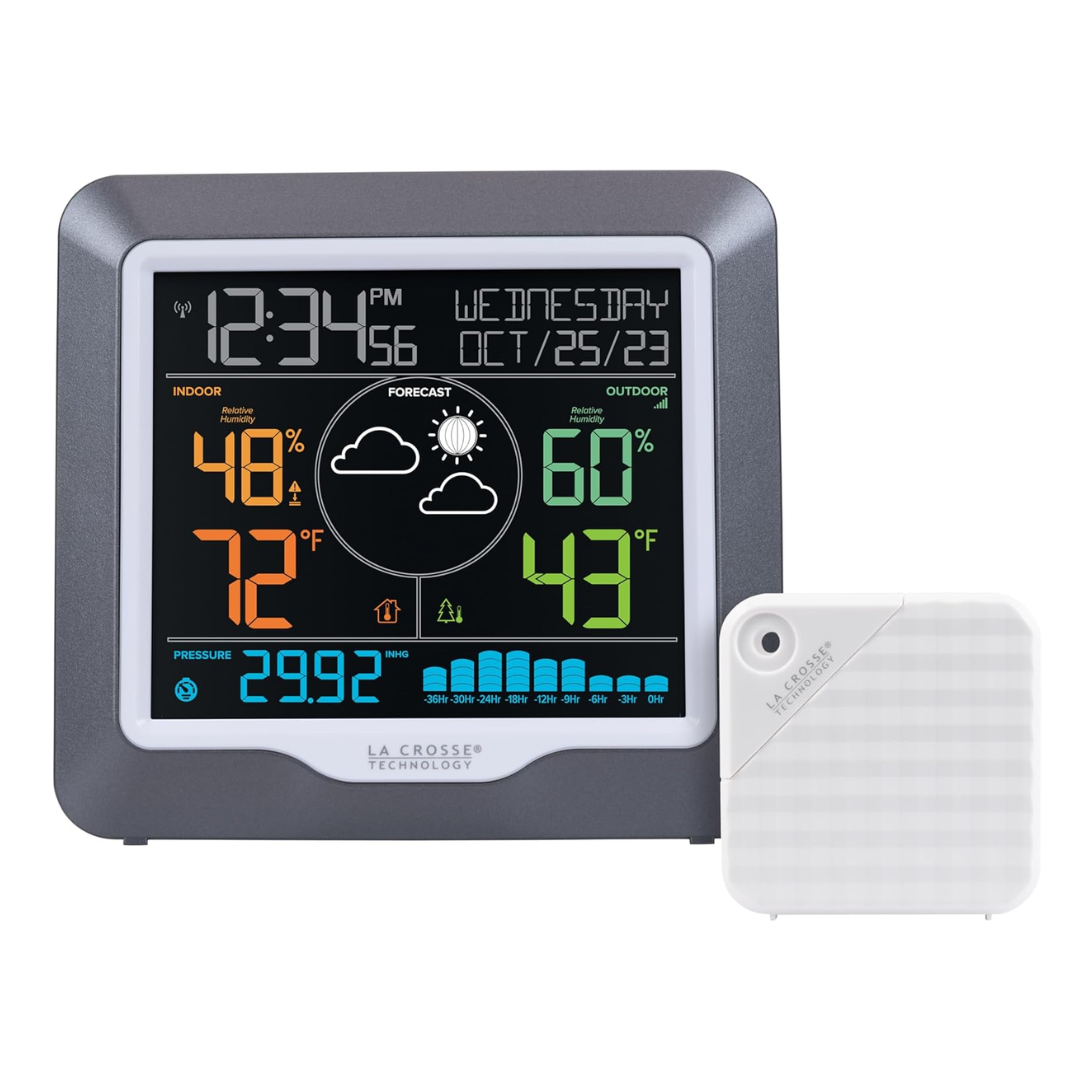 La Crosse Technology's modern weather station equips you with essential information to plan your day. Its vibrant display shows dynamic forecasts, barometric pressure, and local temperature and humidity. With customizable alerts and historical records, it helps protect plants and enhance indoor comfort, making it a stylish and practical addition to any space.