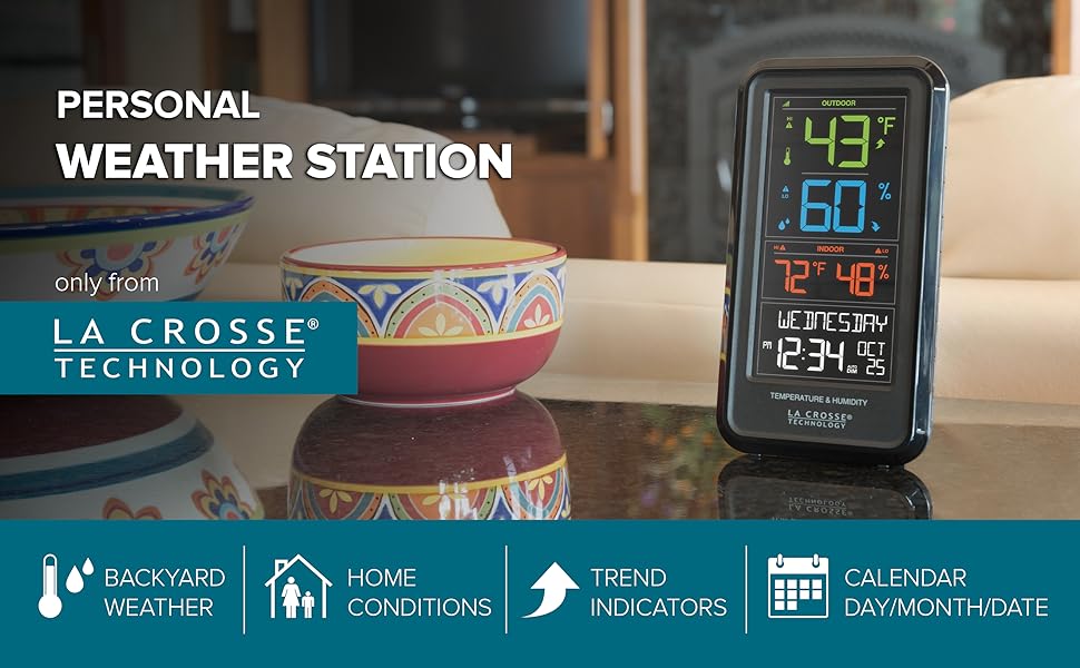 La Crosse Technology's wireless color weather station serves as your personal meteorologist, allowing you to check backyard temperature and humidity effortlessly. It features programmable alerts for extreme climate changes, a dynamic multi-color display, and a calendar view. With a 300 ft range and versatile mounting options, it ensures reliable monitoring.