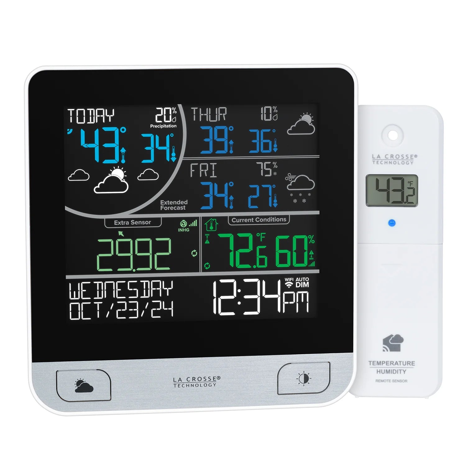 The V15 Wi-Fi Multi-Day Forecast Station provides real-time weather updates with a high-definition display showcasing a 3-day forecast. It includes an outdoor Temperature and Humidity Sensor and supports additional sensors for monitoring rainfall and wind. Paired with the La Crosse View app, it enhances home weather monitoring and alerts.