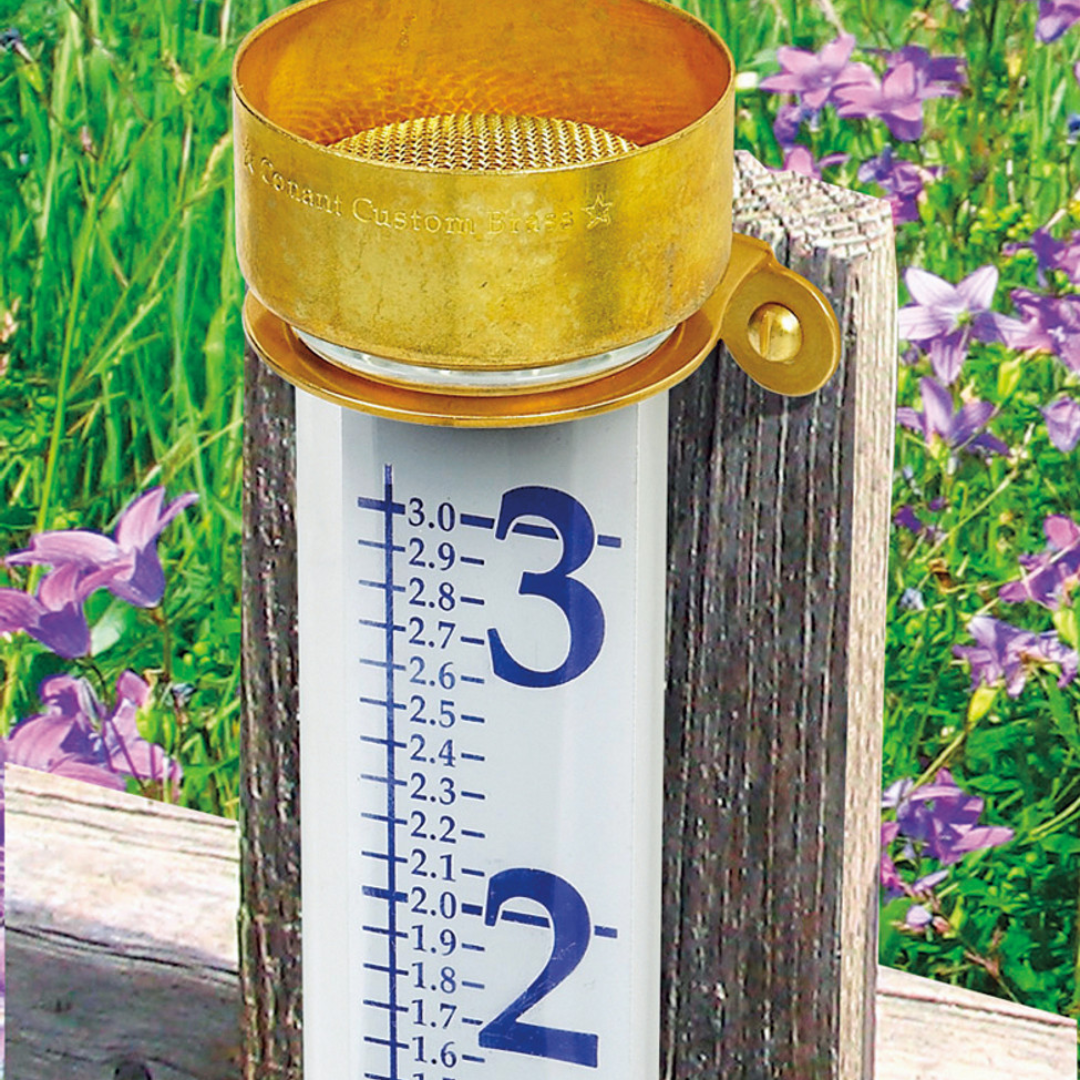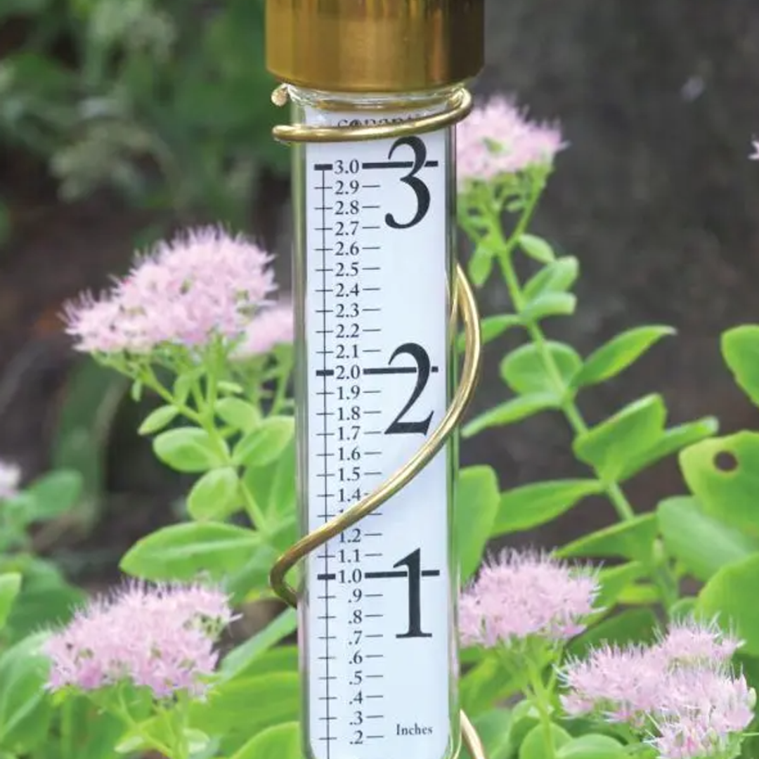 This decorative rain gauge helps you conserve water. It not only collects and measures the amount of rain that has fallen over a given period of time, but it also measures the amount of water used when watering your lawn and garden. Measuring in 1/10 inch increments on one side and 1mm increments on the reverse, the curvature of the glass vial magnifies the numerals by 50%. The twisting stake mounts in the ground, although included hardware also allows you to mount to a wall, fence, or post. A metal screen in the collection funnel keeps out unwanted leaves and bugs.