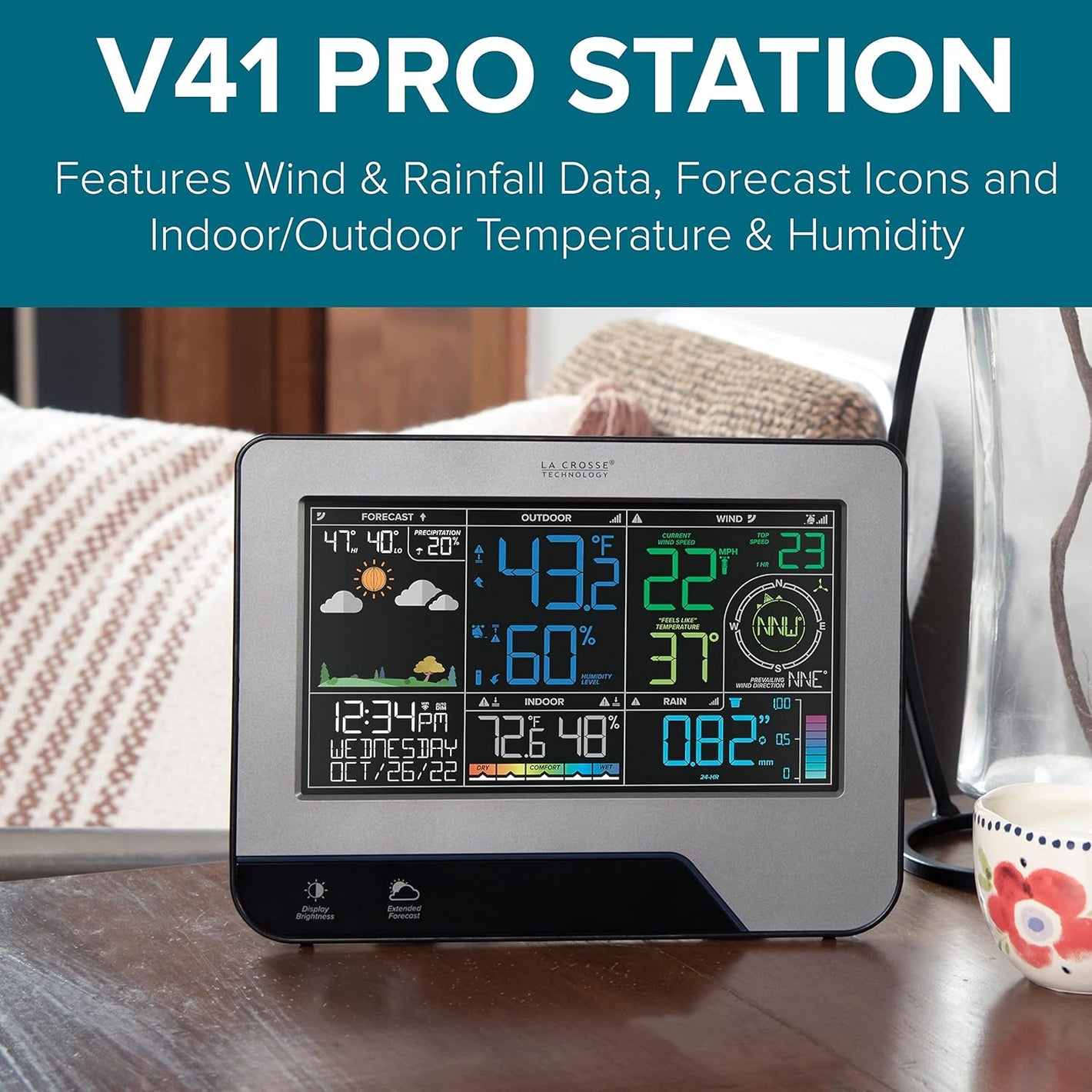 Experience accurate weather tracking with La Crosse Technology's V41 Wi-Fi Professional Weather Station. Ideal for weather enthusiasts, it monitors wind speed, direction, rainfall, temperature, and humidity. The high-definition color display shows indoor and outdoor data along with hourly and daily AccuWeather forecasts, complemented by the La Crosse View app for mobile monitoring.