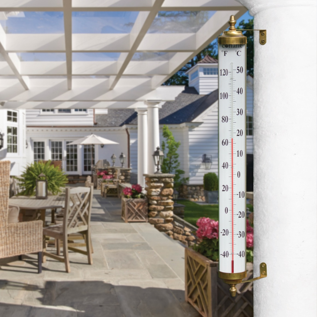 Standing 24" tall, this easy-to-read window thermometer displays temperature in both Fahrenheit and Celsius using half-inch numerals that are double the size of those on most thermometers. The magnifying shape of the glass tube makes the tiny column of red fluid visible.